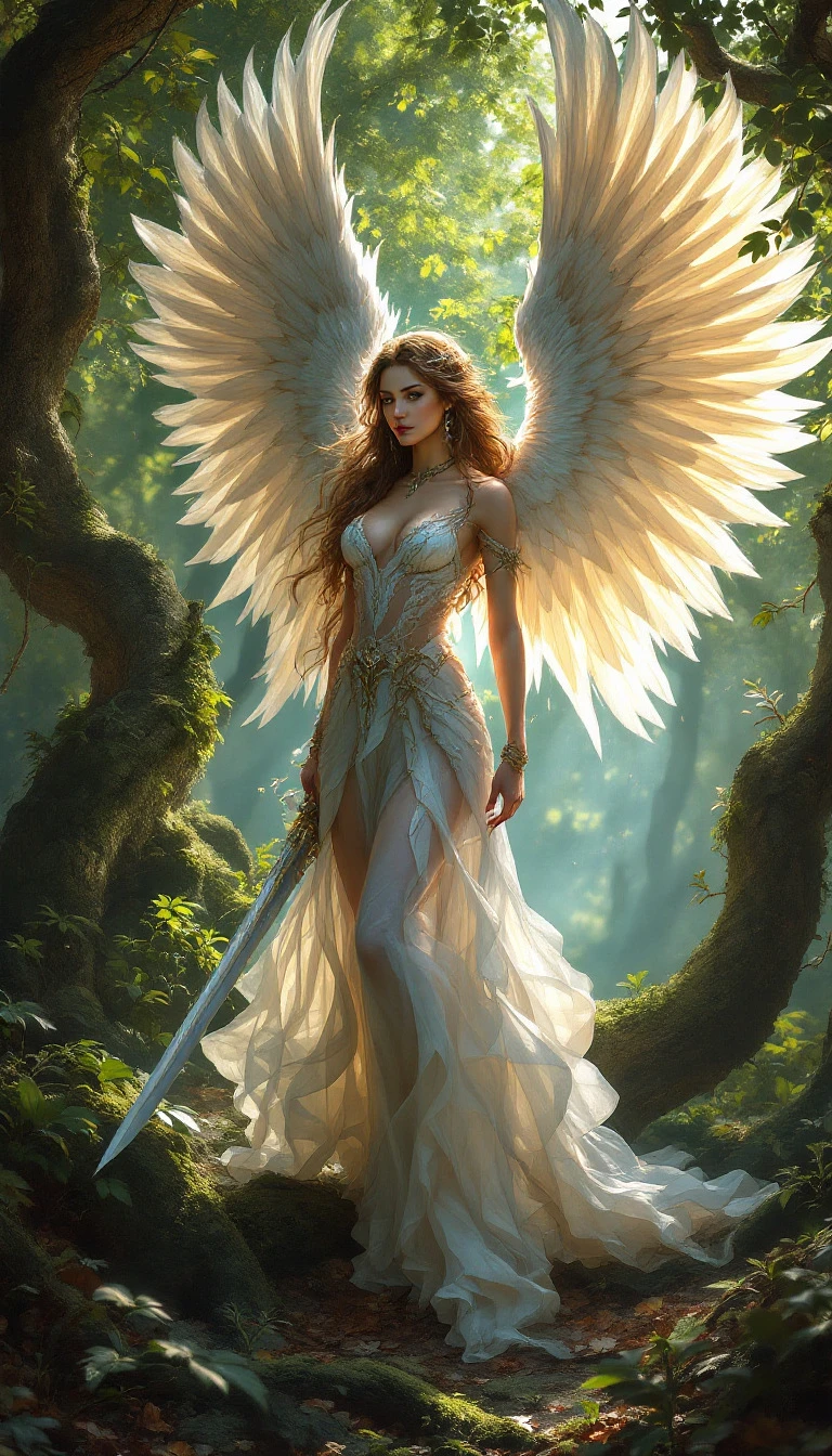 woman with wings and a sword standing in the lush woods, wings majestically spread, gripping her sword firmly, Anne Stokes style, evocative fantasy art, ethereal and angelic atmosphere, intricate details in the foliage and light filtering through trees, concept art, enchanting mood, vibrant colors, high definition, ultra-detailed composition, enchanting and mystical ambiance.
