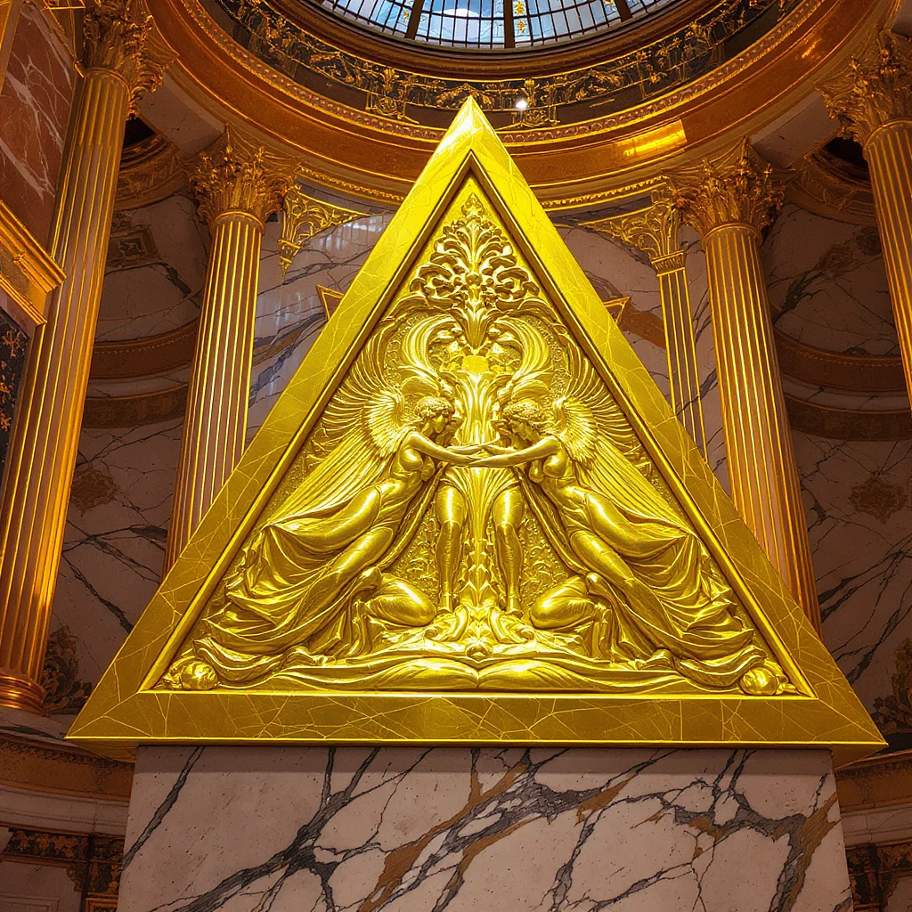 Photo. on the wall of Marmer. On top a golden golden triangle with a big crew on a wall of white gold marmer in a Temple background WITH one Woman erotic statues, a biggest art Musea of all time, the statues of the two two female angels making intencelove in gold -- real prof photo