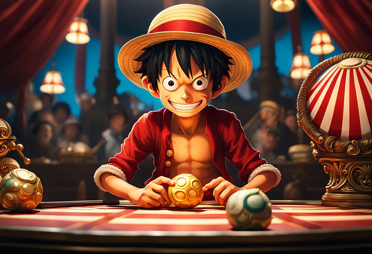 Flat illustration, 3d, close up, Monkey D. Luffy, iconic character form one piece anime, playing a shell game in a macabre circus