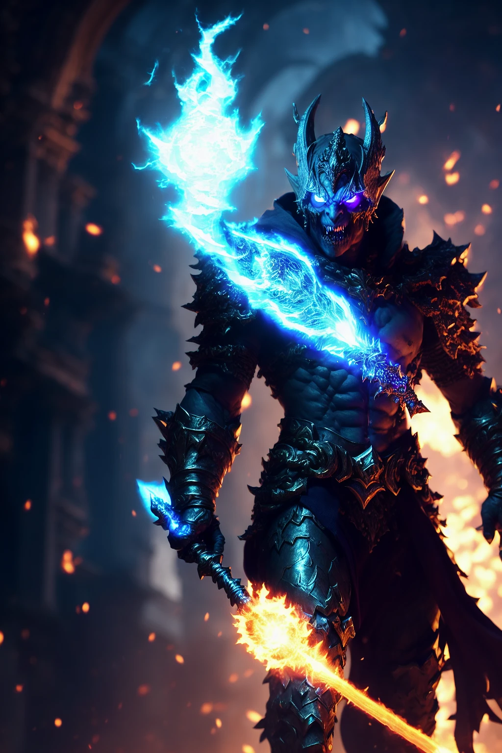 (extremely detailed 8k wallpaper) , a full body shot photo of a fearful undead gargoyle necromancer holds in left hand a wand and in the right hand he is casting a pulsing fireball, intricate, high detail, dramatic