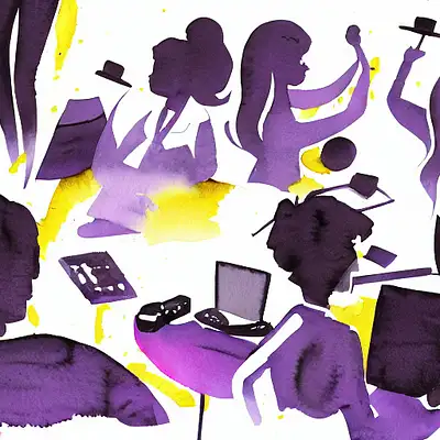 startup office full of people working, watercolor and pencil black and white and light purple