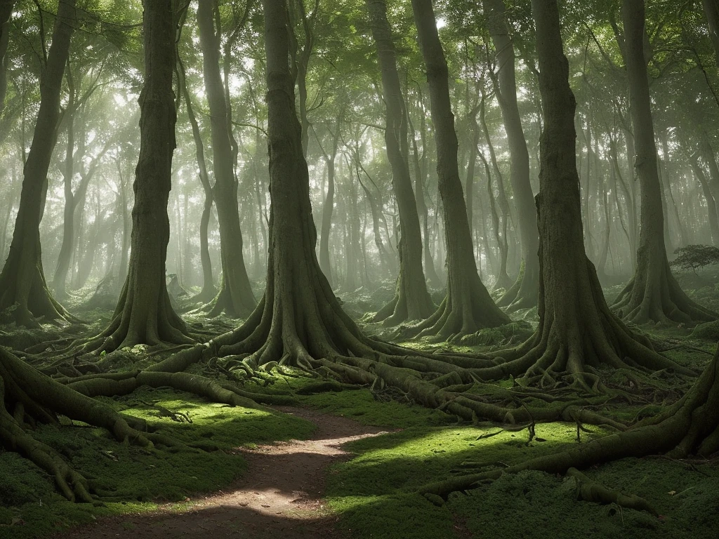 a fantastical forest scene with a wide-angle perspective, showcasing a dense and vibrant environment. The scene is dominated by large, gnarled trees with twisted branches and exposed roots, surrounded by lush greenery and foliage. The atmosphere is mystical, with soft, diffused light filtering through the trees and casting dappled shadows on the ground. The background is a blurred mix of greens and browns, with hints of mist or fog adding to the sense of depth and mystery. The overall style is reminiscent of fantasy artwork, with a focus on creating a sense of wonder and enchantment.