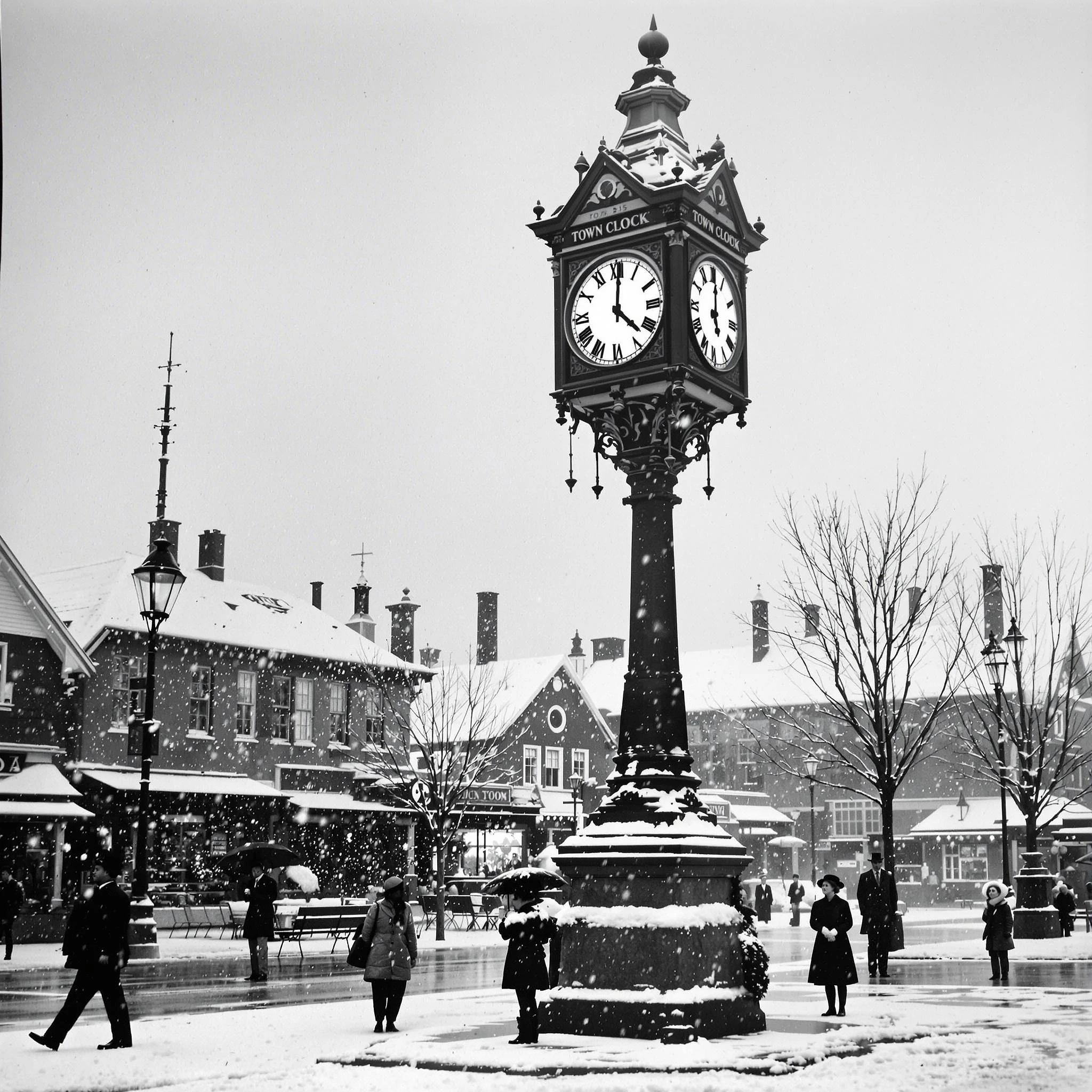 A hyper-realistic black-and-white photograph of a small, snowy town square from the 1930s. The town clock stands tall in the center, its hands stuck at 3:15. Townsfolk are scattered around, frozen mid-action—one man is caught mid-stride, a woman holds an umbrella against the falling snow, and a child looks up at the clock with wide eyes. The photo captures a sense of eerie stillness as if time has literally stopped.