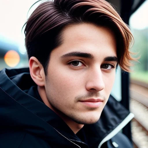 a man is sitting at the train station, dressed in a black raincoat and black sweatpants, short stubble, straight look, manly face, beautiful face, brown eyes, red hair, smooth nose, thin lips, short hair, muted tones, photography, real, professional, 8k, soft natural lighting, portrait photography, lens 85 mm, magic photography, dramatic lighting, photorealism, excessive detail, intimate portrait composition, bokeh, color correction, cinestill 800T --testp --ar 9:16 --upbeta --,