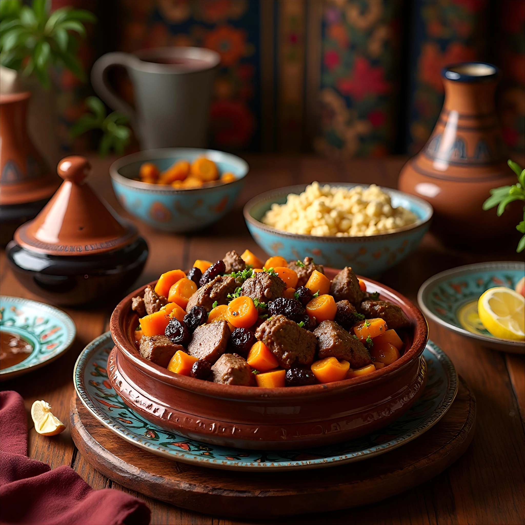 fragrant Moroccan tagine on an elegant cherry wood table, with tender lamb meat, carrots, sweet potatoes, dried prunes, and almonds, slow-cooked in a fragrant sauce with spices such as cinnamon, ginger, and turmeric. The table includes a carafe of Moroccan red wine, a plate of fluffy couscous, and a dish of lemon chutney, set in an exotic setting with rich tapestries and hand-painted ceramic plates