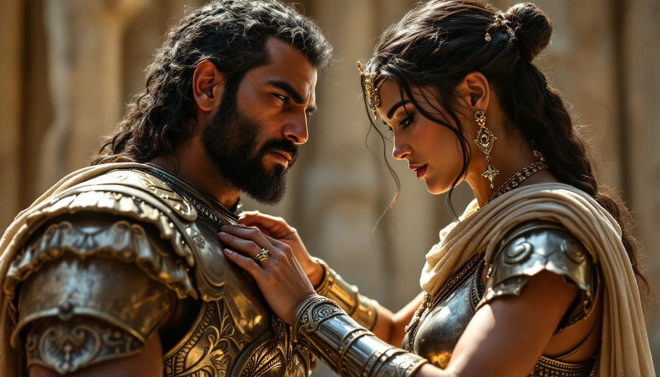 hyper realistic . Medium shot of Ario helping Parushat fasten her armor, respect evident on his face. [Ario: earnest Achaemenid Persian features; Parushat: in engraved Achaemenid armor.]