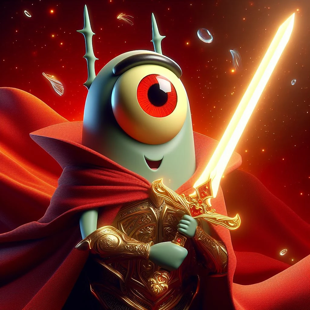 Plankton is the mightiest god using his sword, red eye, heroic pose, divine and celestial light, masterpiece, octane render, 8k, raytracing