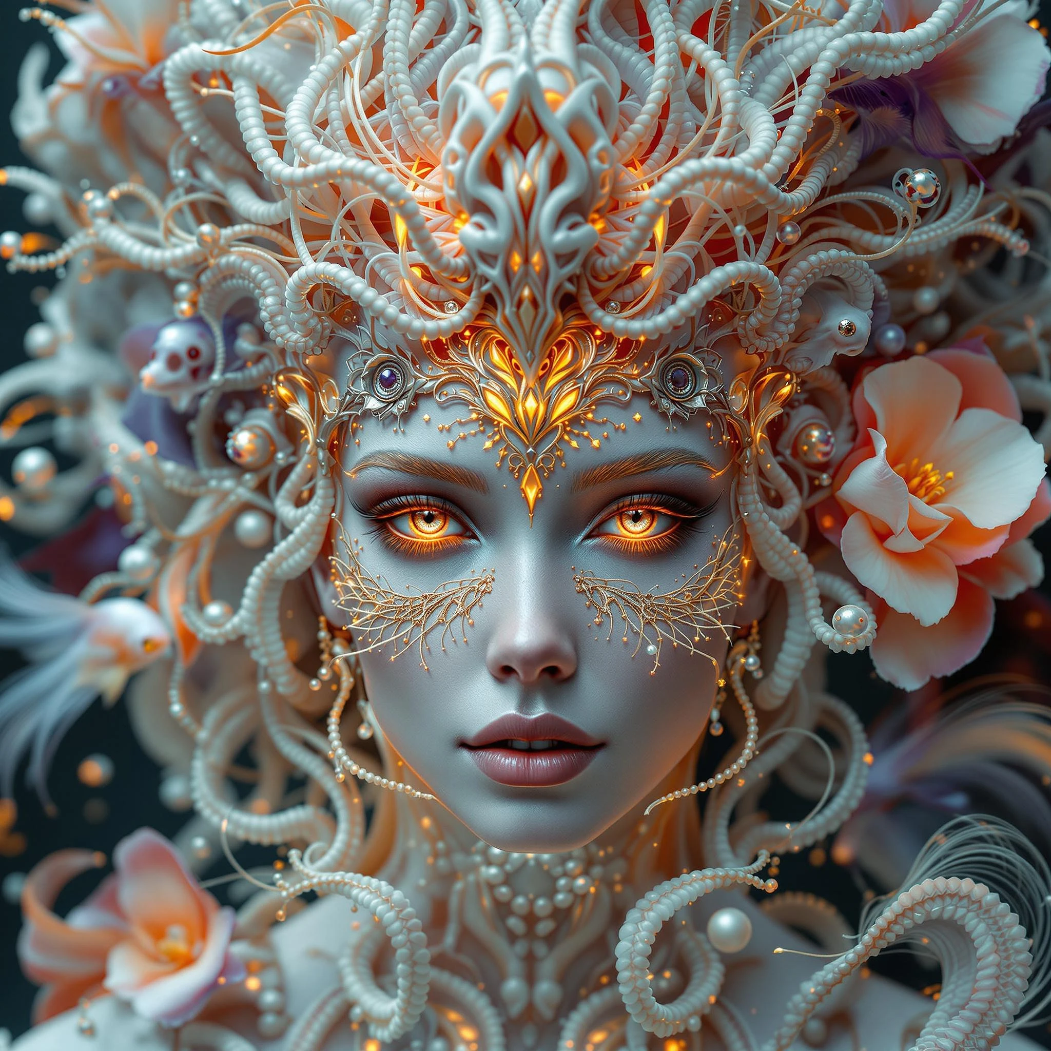 Goddess close-up portrait ribcagel. jellyfish phoenix head, nautilus, orchid, skull, betta fish, bioluminiscent creatures, intricate artwork . octane render, trending on artstation, t symmetrical artwork. cinematic, hyper realism, high detail, octane render, 8k