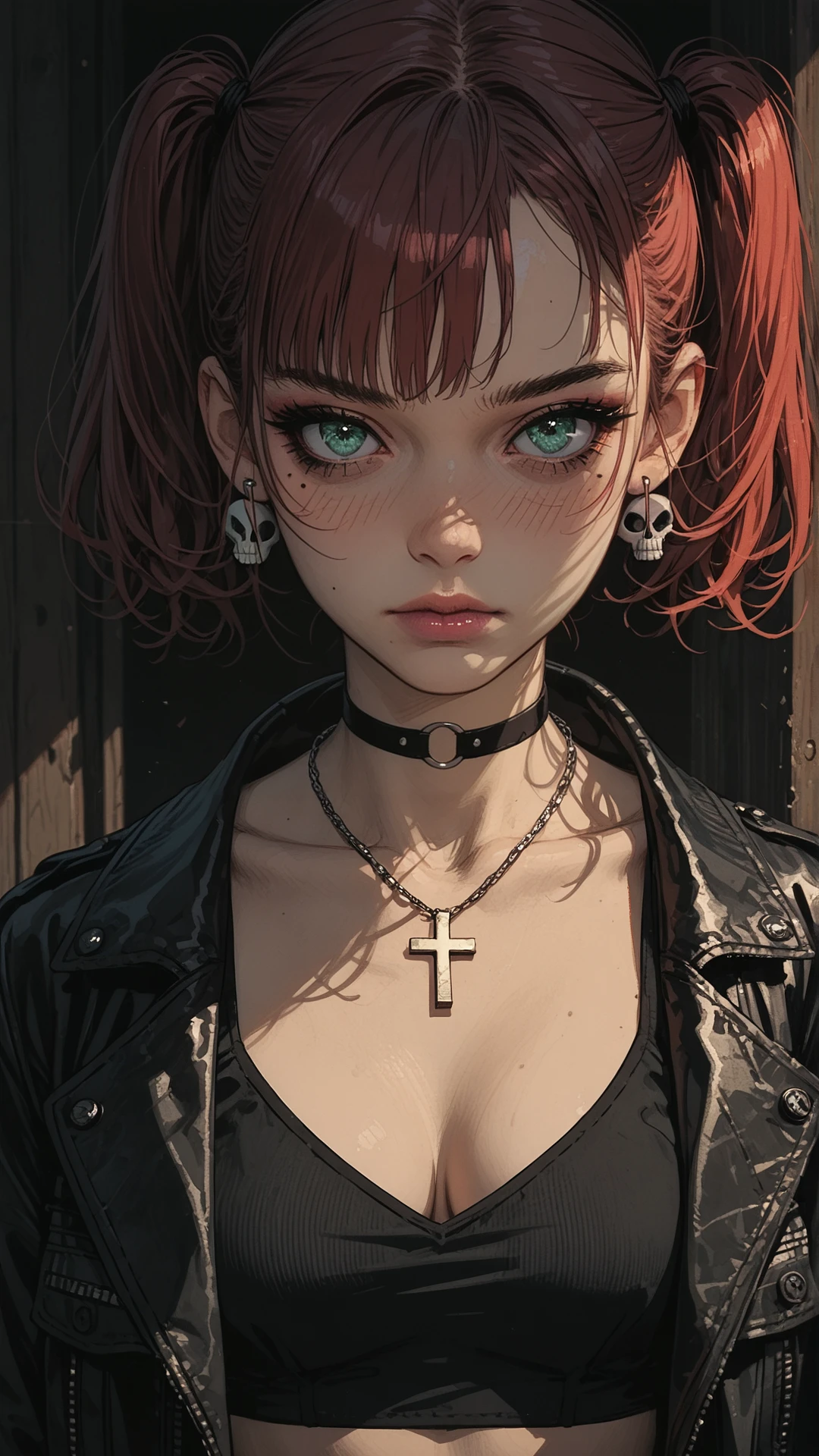 score_9, score_8_up, score_7_up, source_anime, BREAK, female, 1woman, mature, red hair, short hair, (short hair twintails,high twintails,symmetrical bangs,double hair intake) , swept bangs, aqua eyes, black eyeshadow, black winged eyeliner, blush, pink lips, mole under eye, skull earrings, black choker, cross necklace, small necklace, leather jacket, open jacket, black crop top, midriff, black belt, cleavage, looking at viewer, facing viewer, dark room, dappled moonlight, soft gaze, sinozick style, flat color