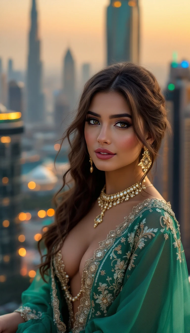 "The woman is dressed in an intricately embroidered, emerald green traditional gown that glimmers subtly in the evening light, showcasing exquisite patterns inspired by Arabian art. Her deep, expressive eyes are adorned with delicate kohl, and her golden jewellery bounces radiant light with each subtle movement. In the backdrop, the towering skyline of Dubai looms, at golden hour blending architectural marvels with the tranquil hues of the dusky sky, adding depth and grandeur to the scene, as the soft breeze carries the scent of exotic spices. "