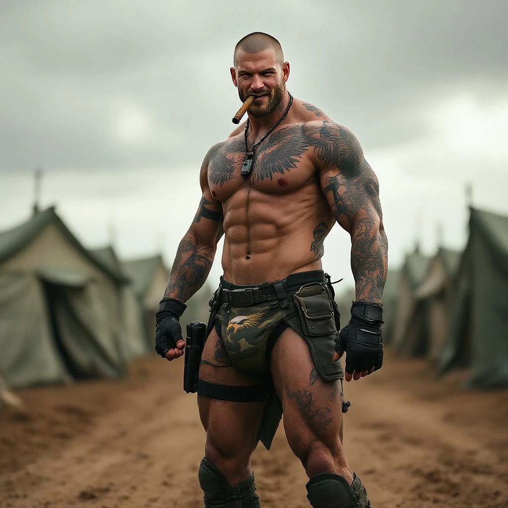 Chris Redfield, Full body image, looking at us, shirtless, slender tall muscular body, lots of tattoos, eagle chest tattoo, dog tags, big cigar in mouth, black fingerless gloves, camouflage pouch thong underwear with huge long semi erect penis bulge, underwear bulge to knees, big feet in black combat boots, standing on dirt road with army green tents, flexing one bicep, grinning