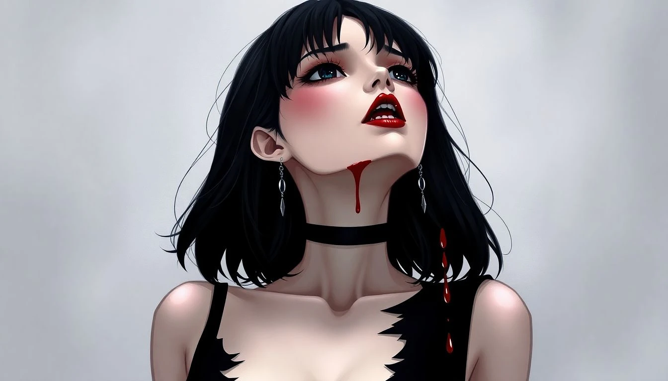a digital illustration of a woman with dark hair and pale skin, wearing a black dress with a choker necklace and earrings. Her hair is dark, shoulder-length, and styled in a messy, choppy manner with bangs that fall across her forehead. She wears a black dress with thin straps and a plunging neckline. The dress has a jagged, torn design at the top, adding to the overall dark and edgy aesthetic. A black choker necklace adorns her neck, complementing her dark hair and attire. She also wears dangling earrings that add to her mysterious and alluring appearance. Her makeup is bold and dramatic, with dark eye shadow, eyeliner, and red lipstick that matches the thick red liquid dripping from her mouth. She looks up towards the top of the image, her head tilted back slightly as if she's about to take a bite of something. Her mouth is open, revealing long incisor teeth and a thick red liquid that drips from her mouth down her chin and onto her front. The right side of her neck has a pair of subtle, circular impressions that are visible on the right side of her neck. The background of the image is dark and shadowy, with a subtle gradient effect that adds depth and dimension. The overall atmosphere is moody and intense, with a focus on the woman's striking appearance and the dramatic lighting. The lighting in the image is dramatic and moody, with a single light source coming from the top-left corner of the image. This creates strong shadows and highlights on the woman's face and body, adding to the overall sense of drama and tension. The camera perspective is wide-angle, capturing the woman's entire body and the surrounding environment. This creates a sense of space and depth, drawing the viewer's eye into the image. The style of the image is dark, gothic, and edgy, with a focus on bold lines, dramatic lighting, and intense colors. The overall effect is one of mystery and allure, inviting the viewer to explore the image further.