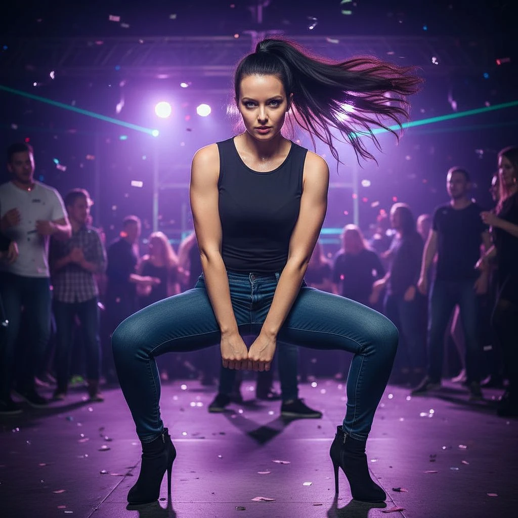 a very beautiful lithe young caucasian woman wearing skinny jeans and a formfitting top is squatting defiantly and dancing at a club with a wild high ponytail. the full-body shot shows her wearing high-heeled shoes. this professional photography captures her stunning look and expression.