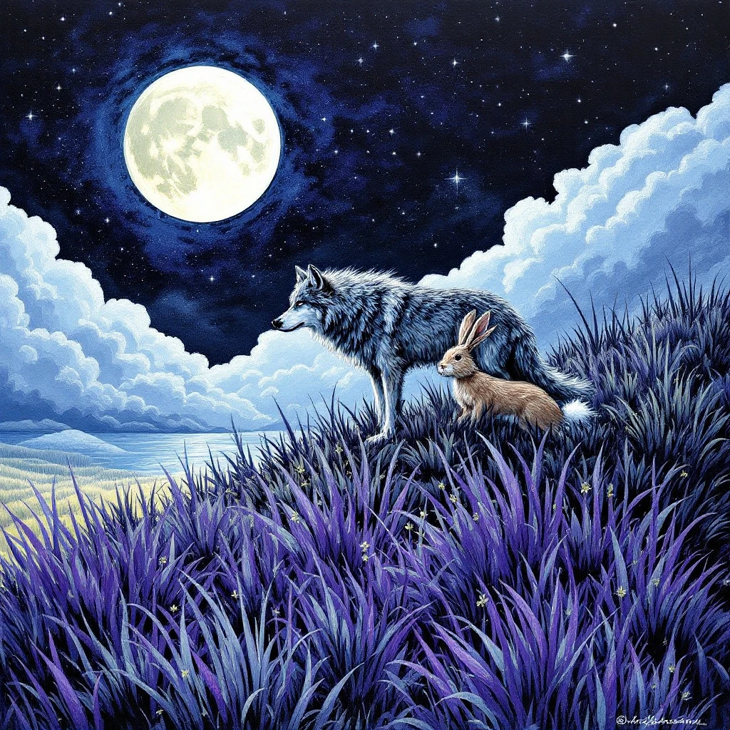 In the left corner, a large moon is shining brightly, purple grass is growing, and a wolf is riding a hare on it