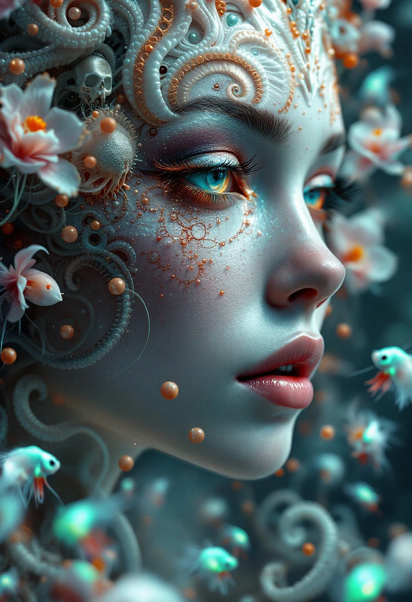 Goddess close-up portrait ribcagel. jellyfish phoenix head, nautilus, orchid, skull, betta fish, bioluminiscent creatures, intricate artwork . octane render, trending on artstation, t symmetrical artwork. cinematic, hyper realism, high detail, octane render, 8k