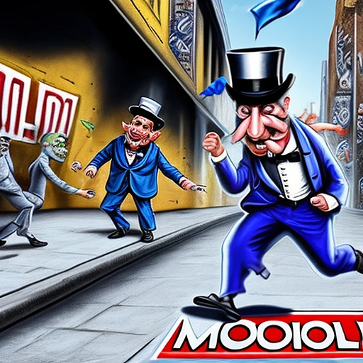 Hyper realistic portrait of of the Monopoly man running away from a anger mob holding a Israel flag, street graffiti characters, hyperdetailed, ultraviolet punkcore, darkyth, cinematography