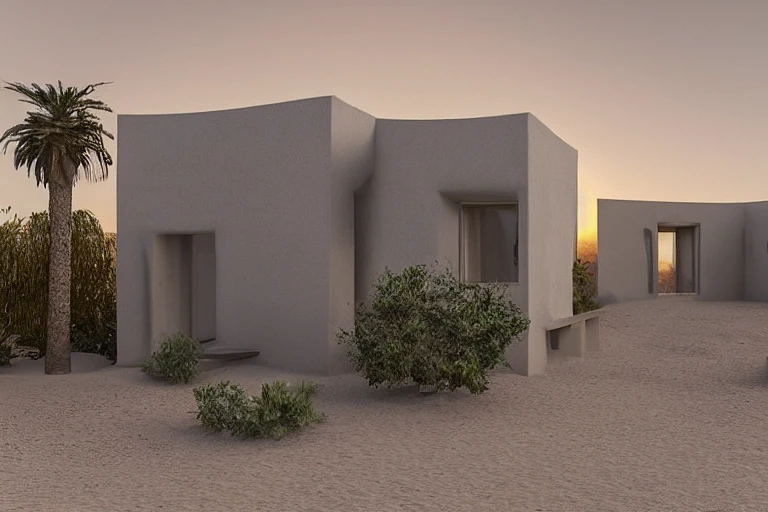 small villa building, Persian cubic architecture style, sunrise, desert environment, small villa, Desert, ash color Concrete, Cubic, geometric, detailed, ultra-realistic, unreal engine, post-processing, 8k octane, de-noise, in frame, centered, wide angle camera, cinematic look, vray, highly detailed buildings, 8k resolution 3d scanned materials, unreal engine, Octane render, hyper realistic, trending on artstation and cgsociety, very bright picture, realistic style