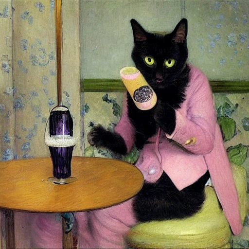 hyper realistic eye level Create a realistic digital flowers with cat drinking a bubble tea by Gustave Caillebotte the artist inspired by realism of a beautiful cat realism like if he was alive today and inspired by modern times full body, pink clothes urban dystopia, hyper realism, artwork featuring a superhero cat enjoying a bubble tea. The cat should be in a playful and whimsical pose, with their superhero costume reflecting their unique feline superpowers. The bubble tea should be prominently featured in the artwork, with the bubbles and colors of the tea adding a sense of fun and playfulness to the scene. The background should be a cityscape or other urban setting, with the environment reflecting the cat's personality and backstory. Perhaps there are other cats in the background who look up to the hero, or maybe the setting includes fish markets and bird cages that the cat must navigate through on its way to get bubble tea. The overall style of the artwork should be bright and colorful, with a focus on capturing the joyful energy of the hero cat and their love of bubble tea.