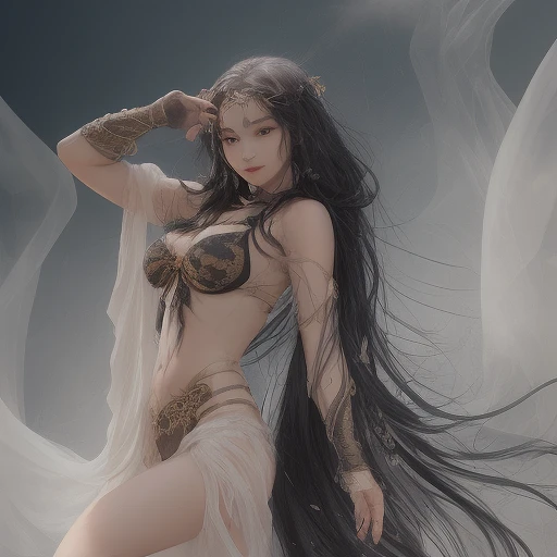 A beautiful Asian woman with long hip length raven hair stands posed elegantly, in a medieval middle eastern village her sultry smile illuminated by warm lighting. She wears a black, gold and crystal jeweled belly dancing attire. One hand rests on her hip, the other on her thigh, as she poses confidently. The sun shines high overhead creating a dreamy, ethereal atmosphere. The scene is framed with a shallow depth of field, emphasizing her expression and the intricate details of her attire. The lighting is moody and atmospheric, with a soft, diffused key light from the front and a subtle rim light from behind, casting a gentle glow on her skin. The background trees are covered in a medieval middle eastern city adding to the serene, otherworldly mood. Film grain and a slightly desaturated color grading enhance the cinematic quality.