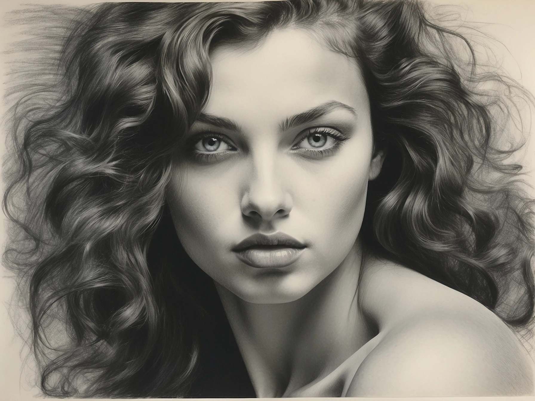 a black and white photo of a woman with curly hair, a photorealistic painting by Laurie Lipton, featured on cg society, hyperrealism, charcoal drawing, hyper realism, photorealistic