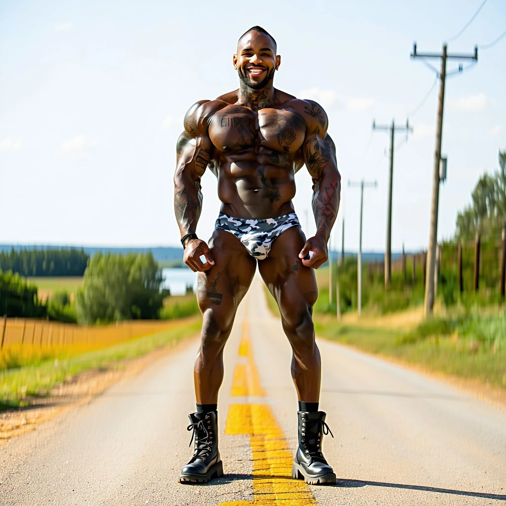 Full body image, tall fit slim white irish bodybuilder, heavily tattooed, slim face, chiseled jawline, shaved head, big dick in camouflage print thong underwear, big feet in black combat boots, big smile, standing outside on dirt road