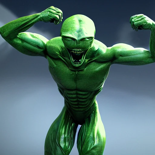 high resolution photography of an alien, Character Design, full body, green, futuristic, highly detailed, brawny, muscles, fitness, dynamic action pose, sharp focus, Unreal Engine 5, Octane Render