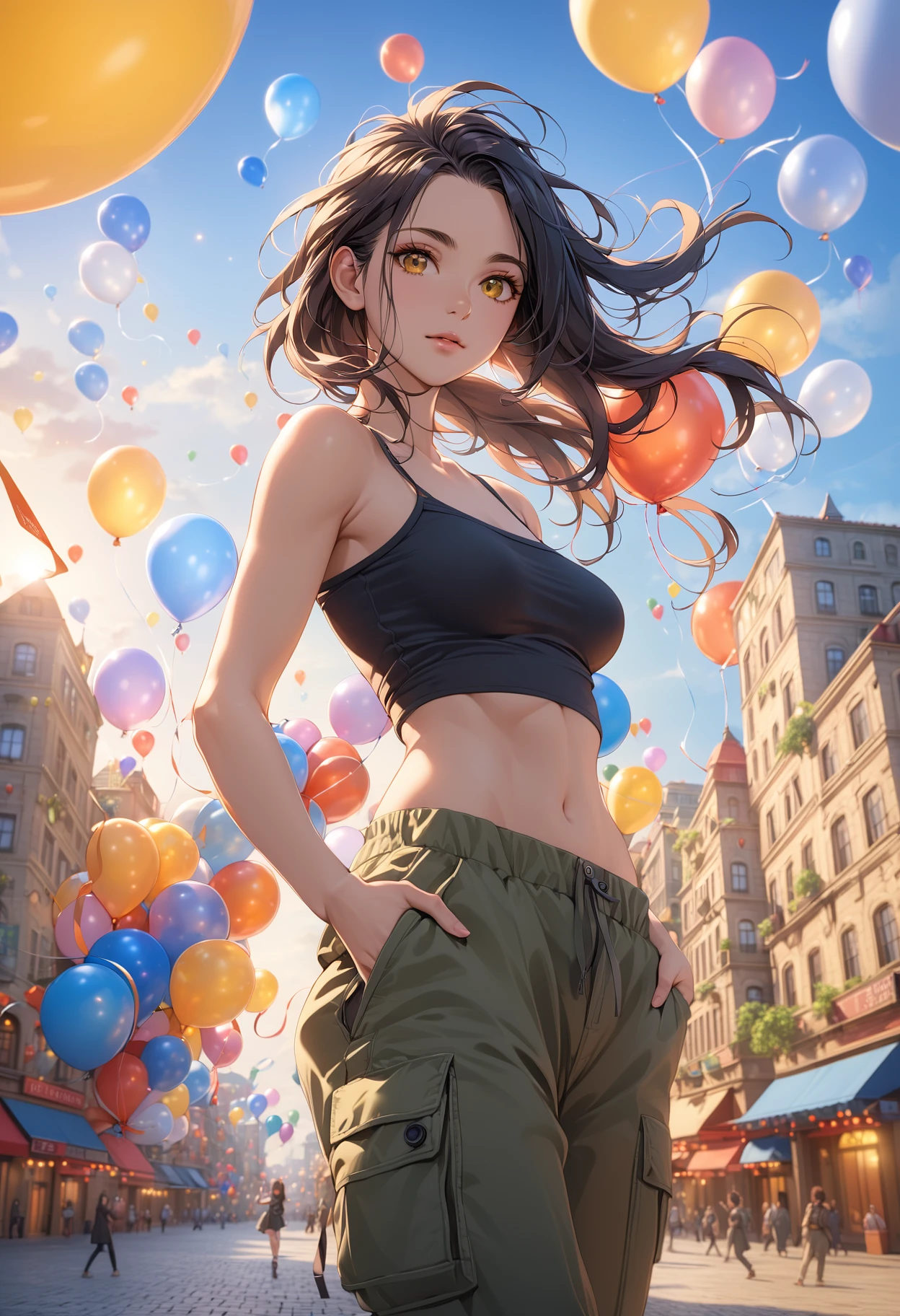 (masterpiece, best quality, highres:1.2) , (intricate and beautiful:1.2) , (detailed light:1.2) , (colorful, dynamic angle) , (full body shot:1.4) , portrait of a beauty, long hair, messy hair, ponytail hair, intense black hair, extremely detailed eyes, yellow honey eyes, medium breasts, fit body, casual clothes, sleek neck top, baggy cargo pants, white sneakers, belly button, bare shoulders, dynamic pose, balloons in the sky, soft light passing through hair, looking at viewer, (futiristic city background,city square:1.3) , (cinematic) , (more details:1.3)