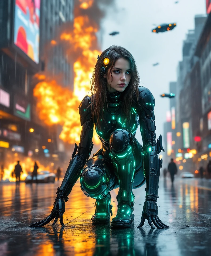 A beautiful masterpiece (8K) full-body portrait of a 20-year-old brunette cyborg. Her helmet is has different levels missing on her left side. Her left eye is an electronic targeting system. Her armor is black with intermittent yellow and turquoise colors that are pulsating throughout channels in her armor. The colors of her legs and feet are mismatched because of her replacement. She is slightly crouched, on the prowl as if she is hunting someone. It is pouring down rain in a dystopian, futuristic city with video boards and neon lights on the buildings. There are flying cars above and between the buildings. Behind her there are explosions of cars and buildings. There are other cars flipped over in the street on fire. People are running for their lives in the background. ultra high detail, extreme details.