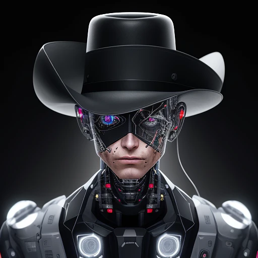 Electronic system on head humanoid, cyborg man, the black cowboy hat, with a visible detailed brain, canon m50 100m| sharp focus| smooth| hyperrealism| --s 1000 --ar 9:16