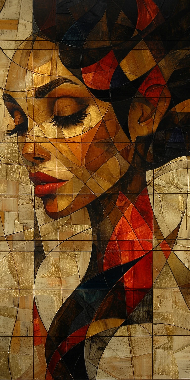 oil painting of a beautiful woman, in the style of geometric shapes and lines, abstract, brown, black, red gold white --ar 1:2 --stylize 750