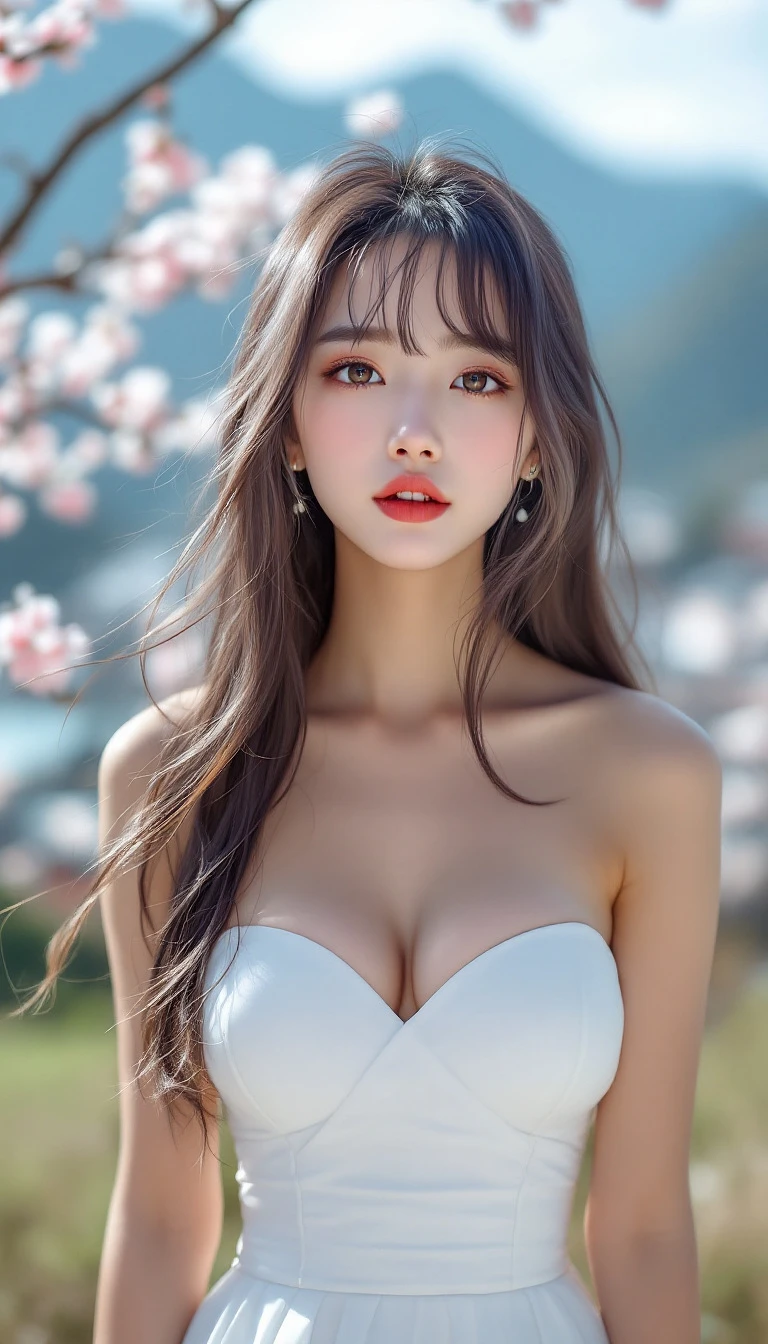 A person, korean ulzzang face, japanese girl, long hair, bangs, multi color hair, wearing a white strapless mini dress, thighs dress, stands outdoors with a smooth light background. background landscape view, village, mountain, sakura tree, Cowboy shot, HDR, highly detailed,
