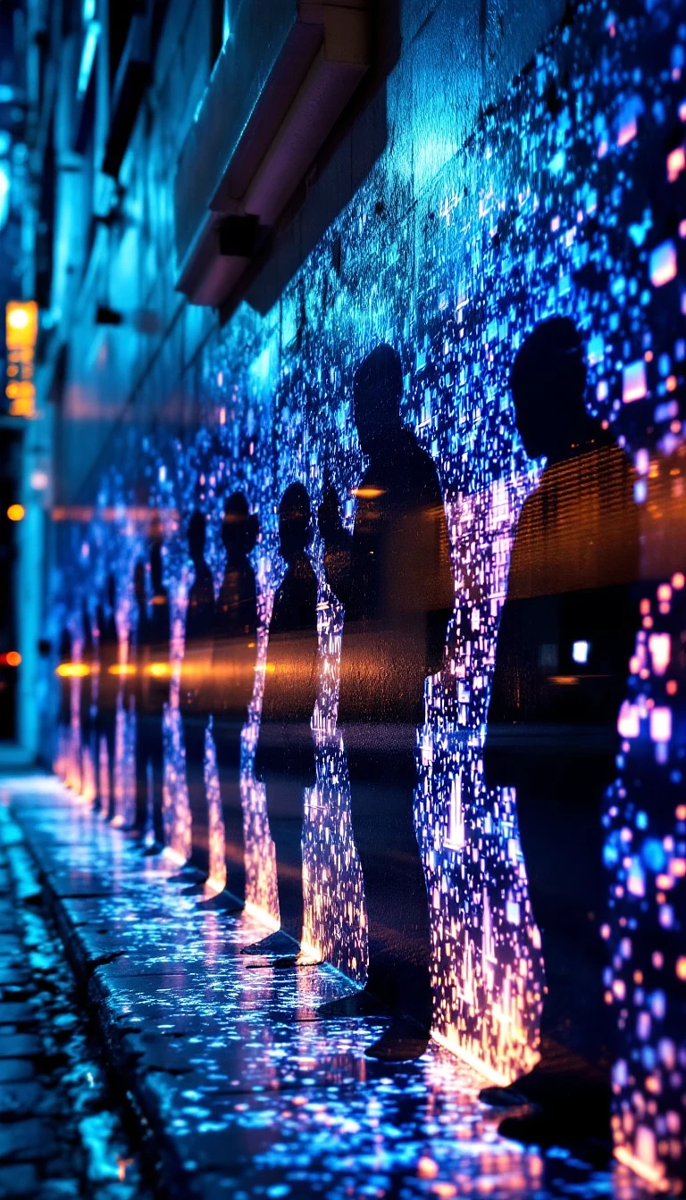 macroview of a street wall, holographic silhouettes of ghosts blended on the wall, teanfroming to in shape of 3D men in style of Aaron Horkey --v 6. 1