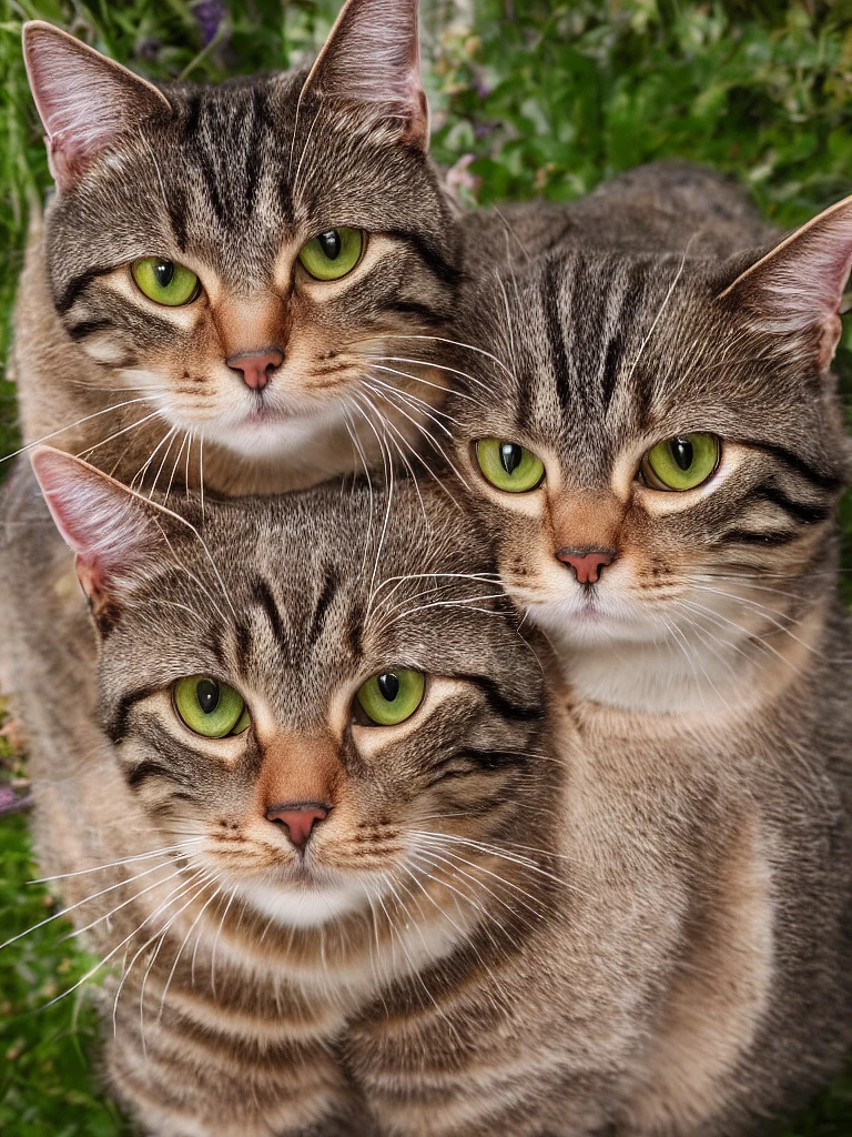 A psychedelic portrait of a beautiful and elegant tabby cat, lovely face, stunningly beautiful eyes, lively realistic, photorealistic, intricate hair details, upfront, 4K, 50mm lens, f2. 8, symmetrical, hyper realistic, sharp image, garden in the background