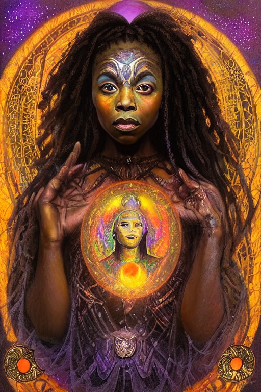 full view portrait of an ethereal black wakanda gypsy woman with detailed eyes, glowing face, holding a crystal ball with a half moon, photorealistic, colorful dress, in the style of ruan jia and gaston bussiere, holographic undertones, art nouveau moon phases mosaic forest background, intricate, smooth, sharp focus, dramatic lighting, illustration, hdr, artgerm