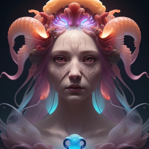 Goddess close-up portrait ribcagel. jellyfish phoenix head, nautilus, orchid, skull, betta fish, bioluminiscent creatures, intricate artwork . octane render, trending on artstation, t symmetrical artwork. cinematic, hyper realism, high detail, octane render, 8k