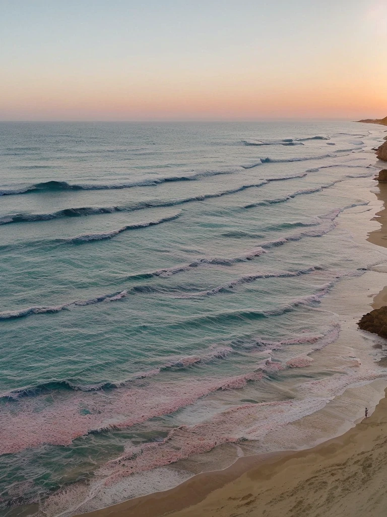 Uma vista serena da praia ao pôr do sol, ondas calmas tocando a areia, céu tingido de tons rosa, roxos e laranjas, silhuetas de pessoas caminhando na praia, evocando paz e contemplação, Pintura, tinta acrílica em tela, --ar 16:9 --v 5