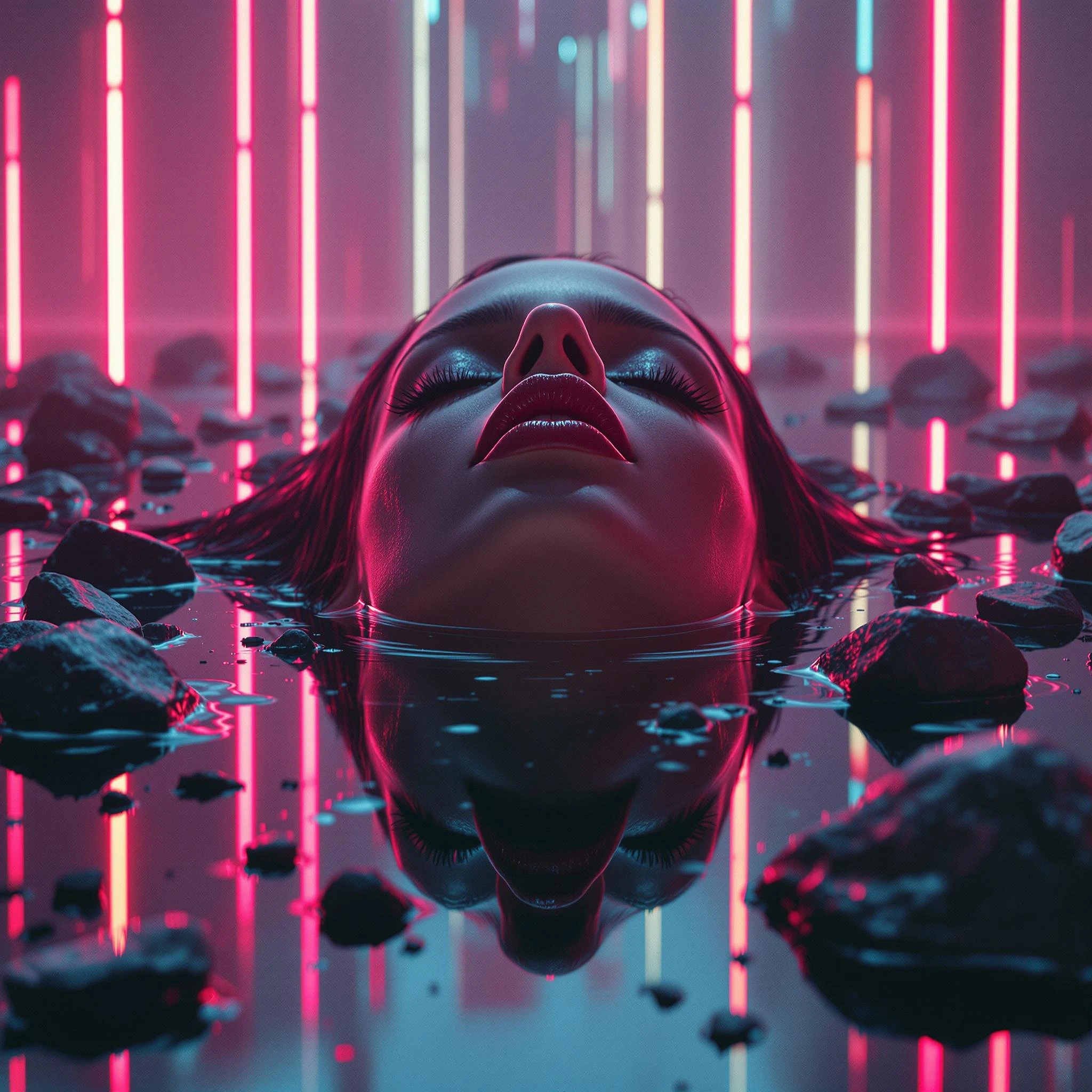 Darkwave, synthwave, many heavy reflective floors and other objects. A very beautiful head of a gorgeous woman emerges in the foreground, epically in a close-up. From the mouth downwards, the very beautiful woman is submerged in a reflective floor. This epic cover for a music album is meant to symbolize the downfall of humanity and the rise of artificial intelligence. Overall, there are many reflective objects in the environment, such as multiple stones, cyberpunk art by Maciej Kuciara, cinematic lighting, flashes, and darksynth concept art.