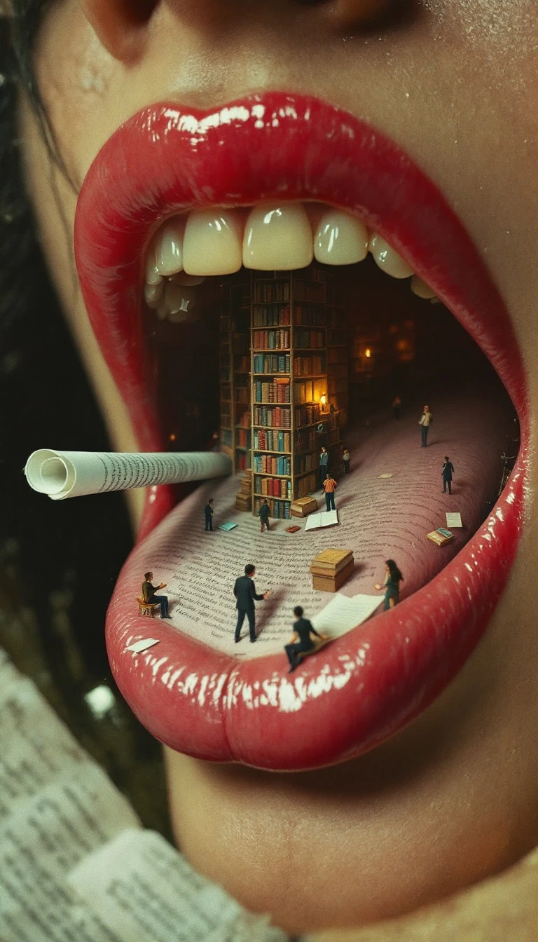22. A surreal, extreme close-up of a woman’s mouth, transforming into a miniature, self-contained library, complete with towering bookshelves, tiny readers, and the faint scent of old paper. Her tongue becomes a rolled-up manuscript. The style is a fusion of detailed literary illustrations with the surreal concept of worlds within worlds.
