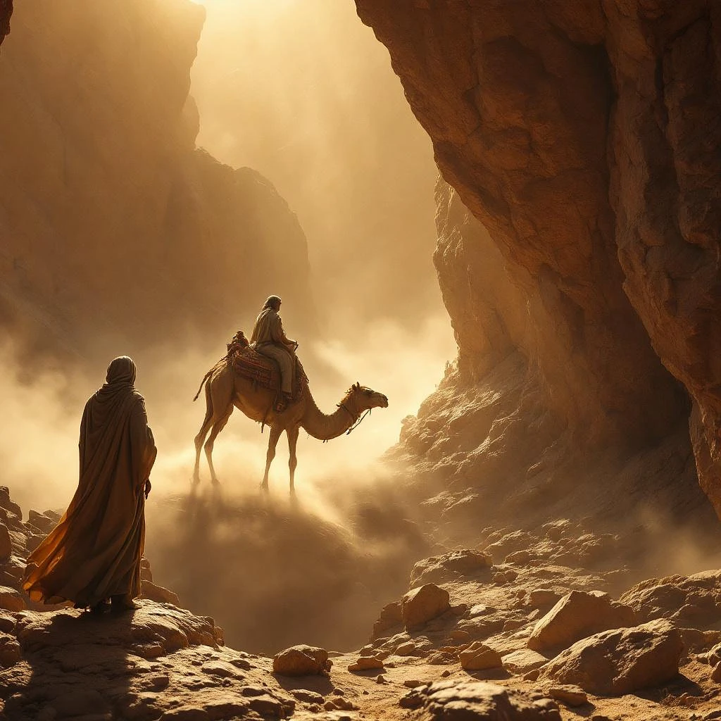 The people of Thamûd were deeply amazed when the camel emerged from the rocks of the mountain, cinematic realistic, photography, dramatic sunlight and casting shadows, sharp focus model, ultra realistic, rich detail --ar 9:16 --style raw --stylize 300