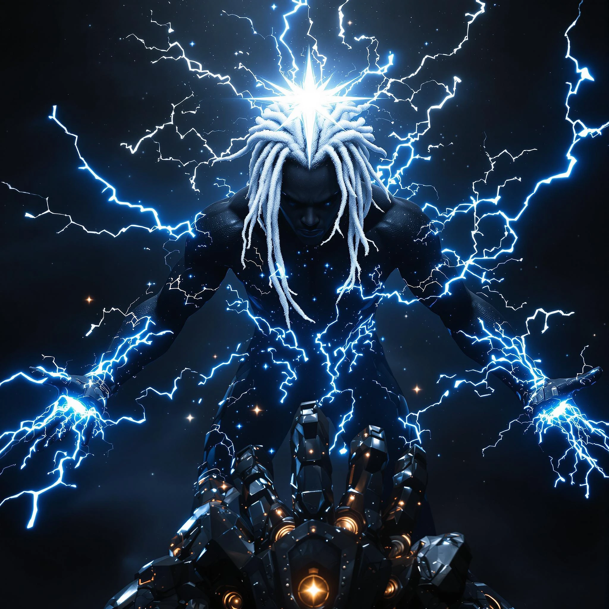 front view of a PHOTOrealistic african american superHERO with white glowing short dreadlocks, his body is covered in pitch black dark shadows and the shadows are filled with outer space and A GLOWING STAR FOR HIS HEAD, HE IS hovering in the air above a large giant metallic hand similar to galactus open wide and blue electrical energy surges along his arms, dramatic light, cinematic lighting, extreme details, unreal engine 5, cinematic