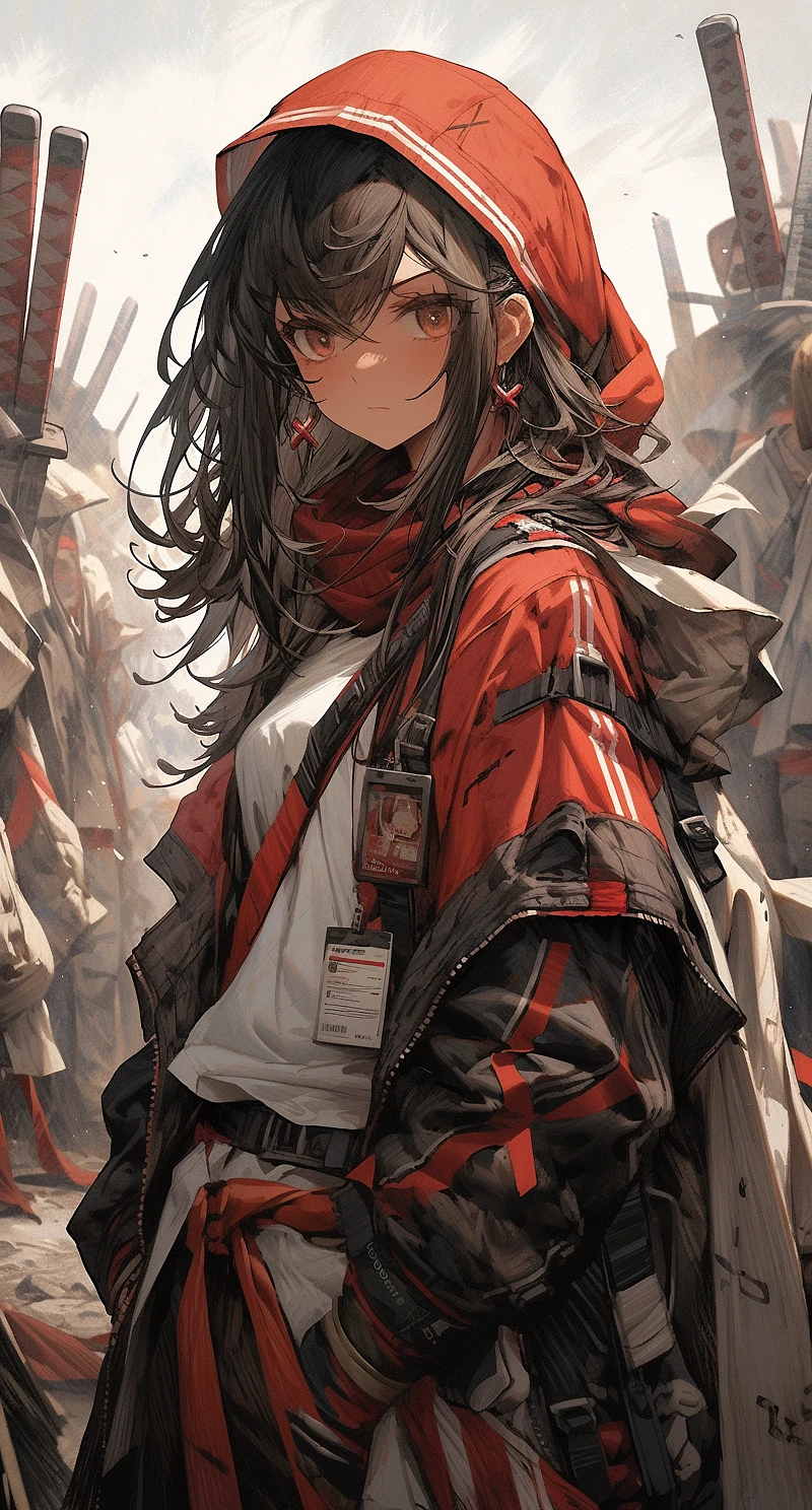 a girl surrounded by mountains with knives and swords on the front, in the style of charming anime characters, hyperrealistic rendering, colorful washes, mimicking ruined materials, kushan empire, light red and brown, konica big mini --ar 69:128 --s 750 --niji 5
