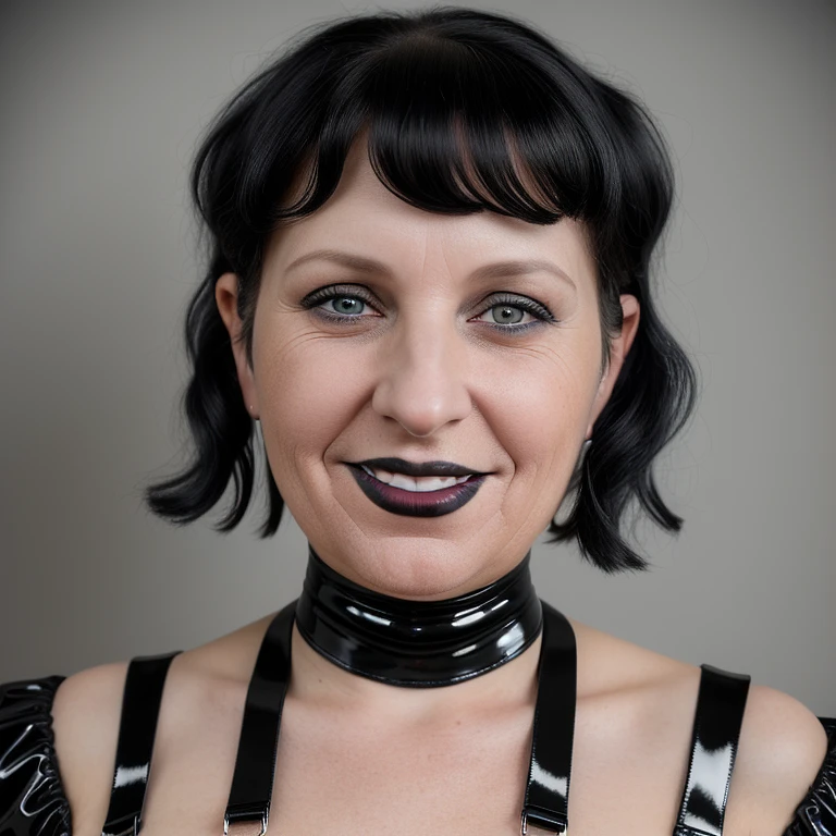 hyper realistic headshot photo of a 45 year old amish woman, wearing a latex corset, black short hair, black lipstick, black jewlery, looking into the camera, smiling slightly, Extreme Close-Ups, Full Frame camera, ISO: 32000, Aperture (f-stop) : f/16, Shutter Speed: 1/30, Camera Lens: 85mm prime lens, Camera Eye Line: Low, Studio Lightning