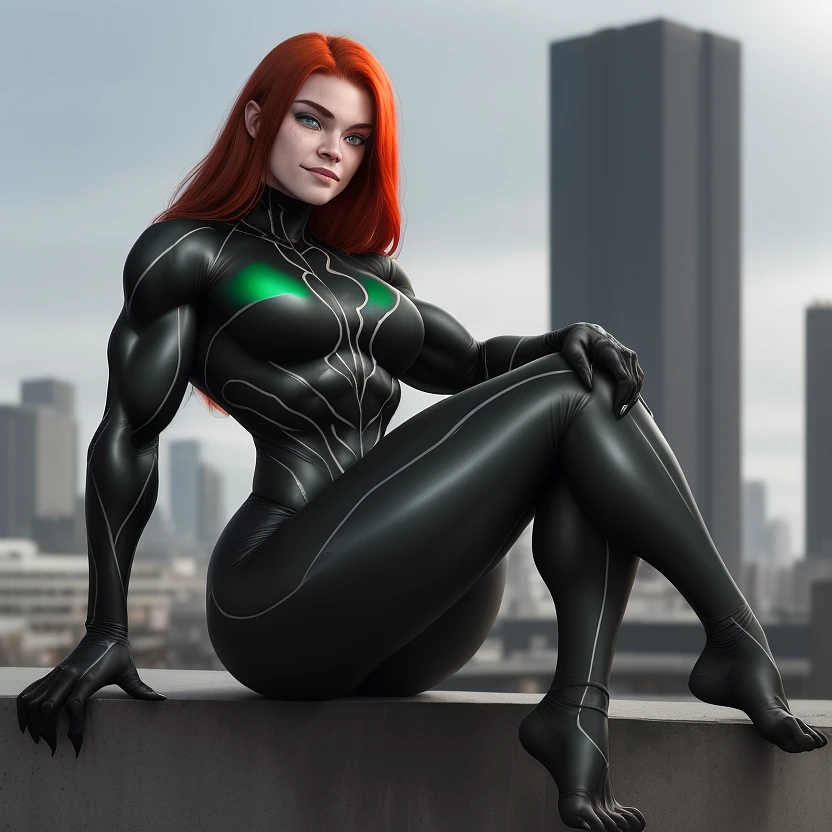 1 young beautiful bodybuilder woman wearing her black symbiote with a wide jaw, full body visible, soft smile, smooth face, happy face expression, red hair, green eyes, sitting on a building, feet visible,