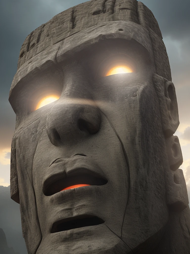 Photo of a ultra realistic moai, one of the famed, giant stone, dramatic light, cinematic lighting, battered, low angle, trending on artstation, 8k ultra HD, hyper realistic, focused, extreme details, unreal engine 5, cinematic, masterpiece, art by studio ghibli, intricate artwork by john william turner