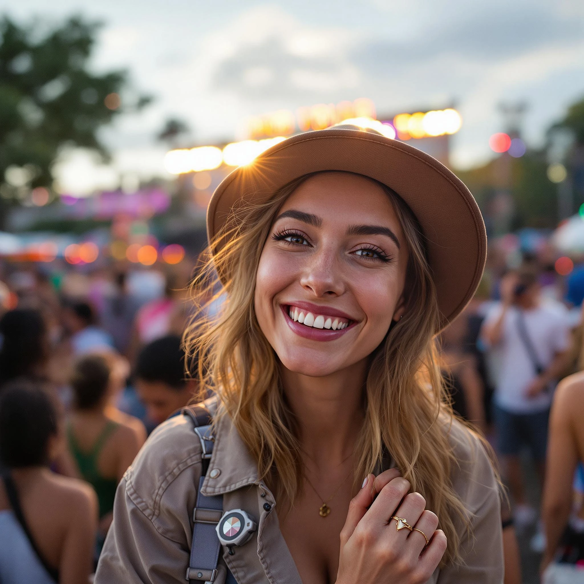 Produce an image of a 30-year-old woman attending an outdoor concert. Use a Sony Alpha 7 III with a 50mm f/1. 4 lens. Capture a full-body view from an eye-level angle, highlighting the lively atmosphere and her enjoyment.