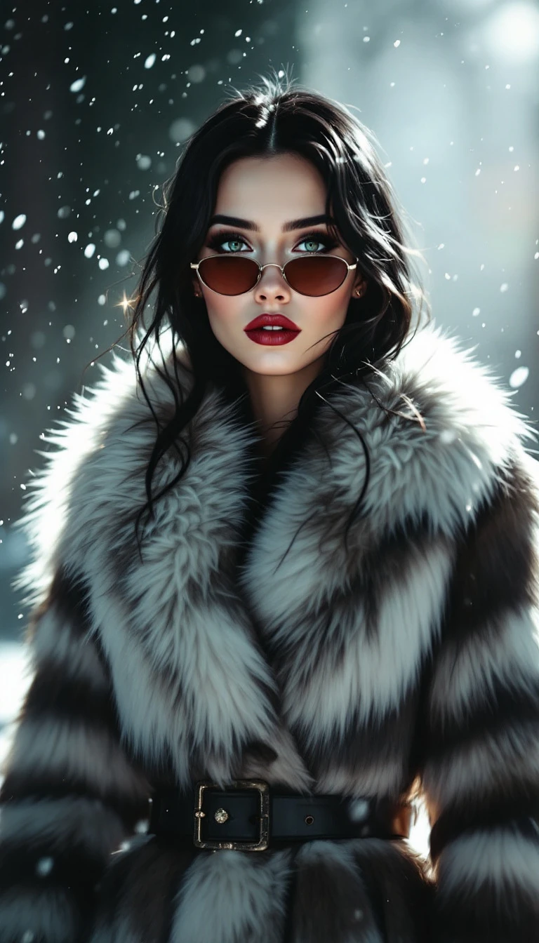 Woman, night-black hair, geranium lips, belted, faux-wolf coat, vermeil lips, sophisticated, luminous setting, tinted shades, jade-green eyes, striking fur coat, celestial, moon dust.