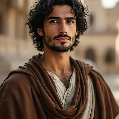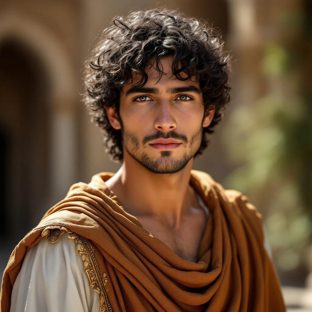 . A realistic image in detail and 8k quality, a Greek student dressed in the style of the Greeks of the Sassanid period, in natural daylight, in the courtyard of Jundishapur University, Full-length standing character detail, along with fine detail and 8K quality. Large, almond eyes with a clear white and dark brown color, full, curved eyebrows that emphasize the beauty of the eyes. A narrow and long nose with a slightly rounded tip and thin, balanced lips that have a natural color. Light and smooth skin with a healthy and natural look, black and curly hair that is soft and natural next to the head. Traditional Greek clothing with meticulous details and delicate weaves, contextualizing according to the culture and art of the time، Eye Shot Shooting Angle Wide Shot Video Shooting Angle with 60mm Telephoto Lens with Focal Camera, Realistic Kinematic Style
