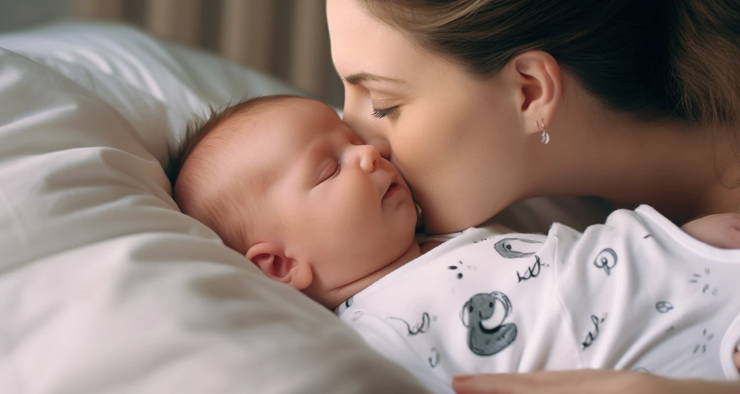 a mother kissing a sleeping baby on a white bed, side view, baby wear a baby sleeping sack, in style of realistic, 8K uhd, high on detail, photography, soft light