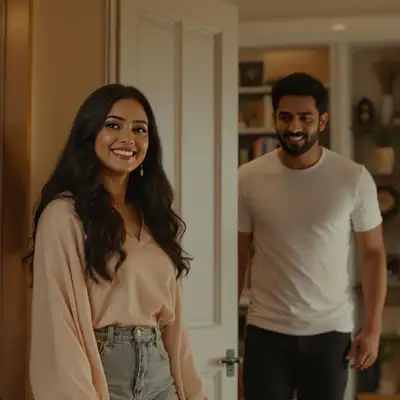 "A cinematic medium shot from a first-person perspective, capturing Rahul Sharma as he stands under a small wooden shed in a rain-soaked park. He wears a fitted white t-shirt that clings slightly to his slim, athletic build due to the dampness of the rain, paired with black slim-fit jeans and white sneakers. His short black hair is slightly damp, styled neatly but tousled by the rain, and his warm brown eyes reflect thoughtfulness and empathy. His posture is relaxed yet attentive, with one hand resting gently on his side as he listens intently. The soft glow of distant streetlights reflects off the wet surfaces and raindrops, creating a dreamy yet somber ambiance. In the background, blurred rain falls steadily, adding to the intimate and melancholic mood. "