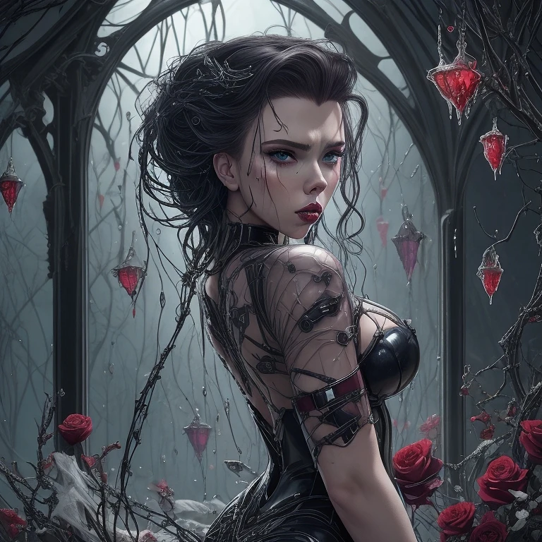 Scarlett Johansson pin up as a cyborg, surreal masterpiece of a gothic snowwhite vampire, crying and angry, gothic enchantress (adorned zentangled :1. 1) , rotated pose glimpsing, translucent mesh, art in style of Mandy Disher, room made of glass, long floral hair, g string, photo front up high, drippy wet, vampire teeth, raining blood, dark, canon 85mm f1, 2, bokeh, cyborg arm, smirk, mad, perfect face, mouth shut, perfect eyes
